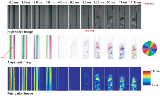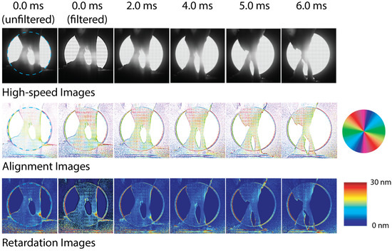 After 4 ms, the specimen was under a uniform state of stress. However, the alignment images from 4 to 8 ms appear faded to a primarily white color. This fading was due to the fact that for the majority of sensor pixels, the calculation of alignment angle was unresolved, and therefore, they were plotted as white. These points can represent alignment angles of 0 or , for which the intensities of the polarization filters at 45 and 135 are the same. Additionally, the difference in minimum resolution of alignment angle that can be calculated is affected by the depolarization difference between the maximum and minimum wavelengths in the light source.