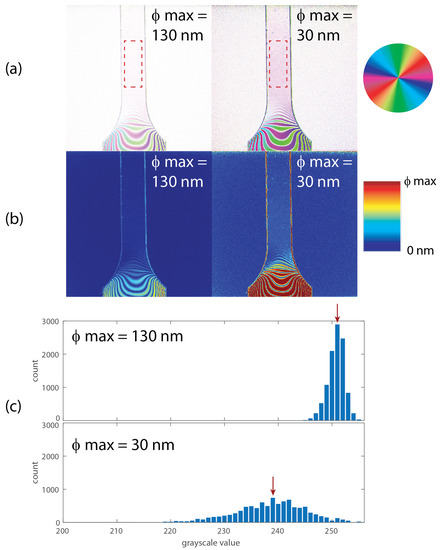 To test this assumption, the maximum range of the retardation calculation was varied for a similar specimen. We adjusted the maximum limit of retardation and considered only the pixels for which the calculated retardation was below the set maximum limit. Figure 6 shows the original alignment angle and retardation images collected during the uniform loading period and similar images after the retardation range was reduced to 30 nm (approximately ). Reducing the range increased the number of pixels for which the alignment angle was resolved, as shown in Figure 6a. Figure 6c is a histogram of the pixel distribution (in grayscale values) for the region at the center of the specimen for both maximum retardation ranges. For the original range, the distribution is narrow about the mean value of 251, corresponding to the unresolved alignment angle (plotted as white in the image). Once the maximum retardation was reduced, the mean value shifted to 239 (light pink), closer to the actual alignment angle, with a wider distribution of values due to the measurement noise and calculation uncertainty. Obviously, adjusting this limit removes some of the retardation information, but it does significantly improve the alignment information.