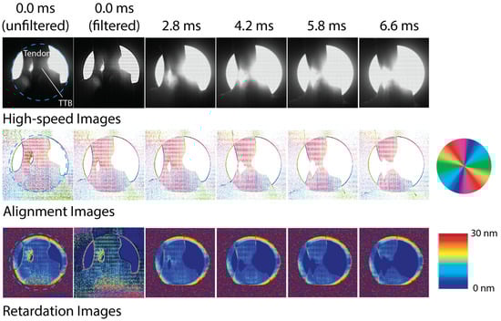 Next, we discuss the imaging of the biological tendon-to-bone specimens under the same dynamic loading. As mentioned earlier, the imaging parameters were not the same for these specimens as for the polycarbonate specimens; therefore, we cannot compare the noise levels quantitatively. Instead, we consider the advantages and disadvantages of the polarizing filter array high-speed camera for testing of these materials. As compared to the polycarbonate, biological tissue acts as a birefringent medium due to the presence of aligned collagen fibers. The medium is partially scattering and partially transparent; therefore, the alignment angle corresponds to the alignment angle of the collagen fibers, and the retardation corresponds to the strength of the alignment [13]. Figure 7 and Figure 8 show the intensity images and the generated alignment angle and retardation images for two tendon-to-bone insertion specimens during testing. The images have been cropped to 508 × 508 pixels (video images) and 254 × 254 pixels (alignment angle and retardation maps). Again, several specimens were tested; the examples shown in Figure 7 and Figure 8 are representative specimens. The two specimens were initially slightly different in geometry, due to the slicing process and variations in biological specimens. For both specimens, failure in the insertion region began at around 6.0 ms. For these images, the tendon region is at the top, and the bone is towards the bottom of the image. A detailed description of the rotation of the collagen fibers during tensile impact loading determined from the high-speed polarization imaging data using the rotating polarizer is given in Wu et al. [13]. Here, we will not repeat the detailed analysis but instead focus on comparing the image quality between the current and previous high-speed imaging methods.
