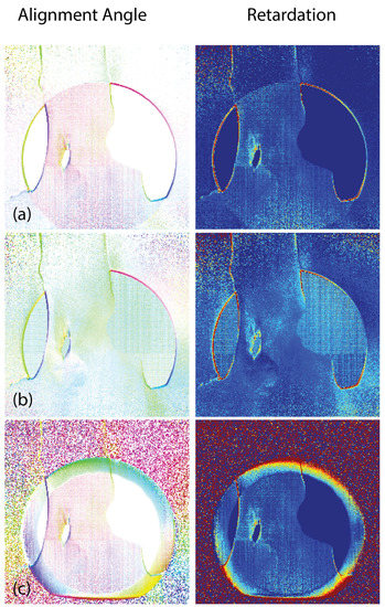Therefore, we collected calibration-polarization-state images using three different approaches: illuminating the camera imaging area with the same camera settings as during the dynamic tests; illuminating the camera imaging area while reducing the camera shutter speed to reduce the light intensity closer to that transmitted through the tendon-to-bone insertion specimen; and placing a woven fabric breather sheet between the laser illumination and the camera imaging array to better replicate a high-scattering material and using the original camera settings. Figure 9 shows the results of calculating the alignment angle and retardation for specimen 1 at 2.0 ms using each of these calibration data files. The same dynamic test image was used for each case. Despite the fact that the case of Figure 9a is the least close the final illumination, it produced the best alignment and retardation images. This calibration case was used for each of the images in Figure 7 and Figure 8. It is encouraging that the region of the image with the high light intensity (where the light is not passing through the specimen) did not corrupt the rest of the image.