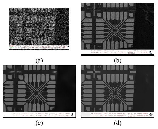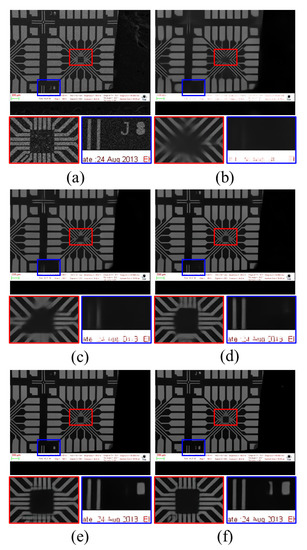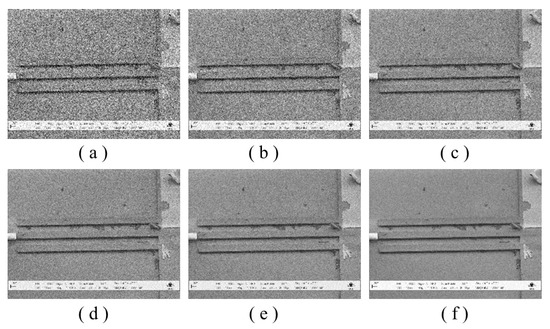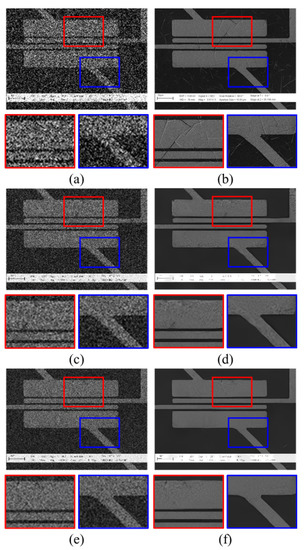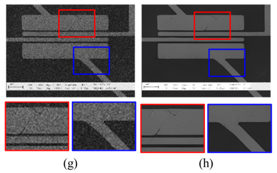 Figure 6 shows the SR results using an average-denoised LR image. Figure 6b is the target HR image whose corresponding LR image is in Figure 6a, which is the aligned dataset generated for evaluation during the test phase. Figure 6c,e,g show , , and , respectively. Figure 5d,f,h show the output SR images trained on the paired dataset generated by the proposed scheme. Comparing Figure 6a with Figure 6c,e,g, the effectiveness of average denoising is confirmed. While almost no details are found in Figure 6a, structural and texture details are seen in Figure 6g. Correspondingly, the SR results show more conceivable results with fewer crumpled areas and sharper edges.