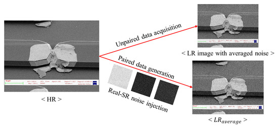 We assumed that multiple images were acquired with a camera in actual semiconductor settings that encompass general real-world problems. Hence, a different approach is required than the conventional SR task that utilizes traditional HR–LR pairs. There are three main problems with the semiconductor image dataset. First, unlike the generally organized paired dataset, actual HR–LR pairs are not applicable for supervised learning directly owing to misalignments. Second, the existing SR algorithms address very low noise or even noise-free environments that have discrepancies in terms of acquiring real-world semiconductor images. Third, a public dataset that is in agreement with the problem formulation is not provided. Therefore, we propose a general scheme to create an unpaired heavy-noise dataset by generating data to overcome the above problems.