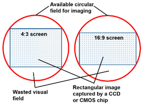 The loss of image content by a rectangular screen is illustrated in Figure 2. In both panels, the red circle represents the image field (IF) in the image plane, which is a plane within the camera where the sensor chip is placed. The IF is circular because the camera lens is always round. To produce a rectangular image from a round lens, the circular IF in the image plane must be cropped. For an image with a 4:3 screen ratio (left panel), this cropping wastes 38.9% of the available IF (i.e., the four white regions within the red circle are wasted). For a 16:9 image frame (right panel), the wasted area increases to 45.6%. Because, as mentioned earlier, the DA wearable “shoots” blindly, the risk of information loss due to the cropping effect is very high. To illustrate, let us imagine the case where one is blindfolded but left with a rectangular opening to observe the world. Certainly, it will be more likely to miss a target of interest compared with the case without such a blindfold.