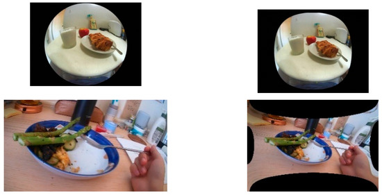 In recent years, there has been a steady trend of applying AI algorithms to image data acquired by DA wearables [38,39,40,41,42,43,44,45]. The AI approach not only reduces the data processing burden on researchers and dieticians, but also provides a solution to the privacy problem described in the Introduction section. However, as opposed to the lens orientation adjustment mechanism, which has been implemented and field-tested, we have not yet utilized circular images for real-world DA. The main reason was the difficulty encountered in data processing using AI algorithms. Currently, the existing convolutional neural networks (CNNs), which are the central components of AI algorithms for food image processing, are almost all designed for rectangular images [38,43,46,47,48,49]. Although isolated studies have been conducted for circular images, e.g., [50,51,52], they require training using the same type of images, which are not widely available. Research is ongoing in our laboratory to solve these problems.