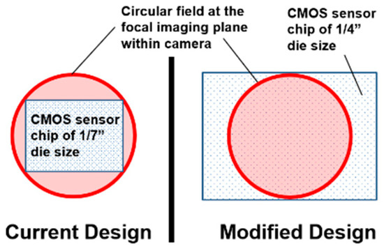 The current (left) and proposed (right) designs to acquire circular images using rectangular image sensor chips of different sizes.