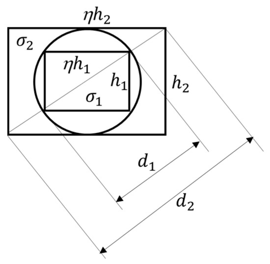 For simplicity, let us consider only the largest circle contained in the outer rectangle, as shown in Figure 5, which corresponds to the equal sign in (3). As and are both diameters of the circle, we have