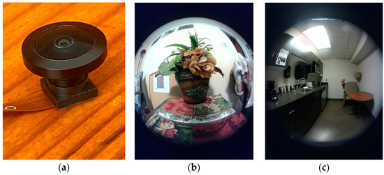 The second method to produce circular images is to use a commercial fisheye lens. Previously, a fisheye lens was usually long and heavy, unsuitable for use by DA wearables, which cannot be made cumbersome. In recent years, lens technology has improved significantly, and smaller and shorter fisheye lenses are now available. Despite the improvements, these lenses are still generally longer and heavier than non-fisheye lenses. The left panel in Figure 7a shows a fisheye lens that we have tested. This M7-lens (Type M7-1-08-Y, Nuoweian Inc., Shenzhen, China) has a focal length 1.08 mm, weight of 2.1 g, and height of 10.7 mm (about 15 mm after threading on a lens seat shown in Figure 6). Figure 7b,c shows two raw images obtained using this lens. It can be observed that these images are not completely circular. Portions of the image along the narrower direction of the image are missing. This phenomenon is quite common in small fisheye lenses. Although small portions of the circular field are lost on both sides, the empty regions outside the circular field are smaller than those shown in Figure 2, indicating a more efficient use of the active rectangular area of the sensor chip.
