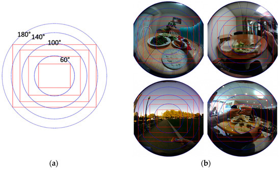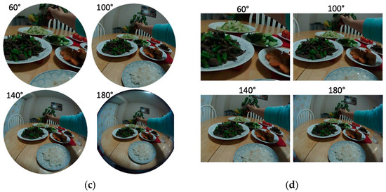 The four blue circles in Figure 8a present circular image domains with FOVs equal to 60°, 100°, 140°, and 180°. For each circle, the inscribed red rectangle represents the traditional rectangular image domain (assuming the 4:3 screen ratio). Figure 8b shows four real-world food-containing images superimposed with the same image domains in Figure 8a. It can be observed that, for most of these real-world scenarios, both rectangular images and circular images with smaller FOVs tend to lose information because of missing or cutting portions of foods. Under the same FOV, the loss by the rectangular image is much more significant than the loss by the circular image. To facilitate observation of the losses, the circular and rectangular images corresponding to the top-left image in Figure 8b are shown in Figure 8c,d, respectively, for all four FOVs (labeled). It can be observed that circular images, especially those with larger FOVs, preserve image contents well. On the other hand, rectangular images are subject to higher risks of missing important food information.