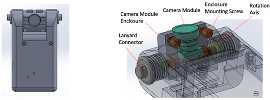 Left panel: Front view of the eButton with adjustable lens orientation; Right panel: Mechanical structure of the lens orientation adjustment assembly. For clarity, the device case is depicted in the transparent form.