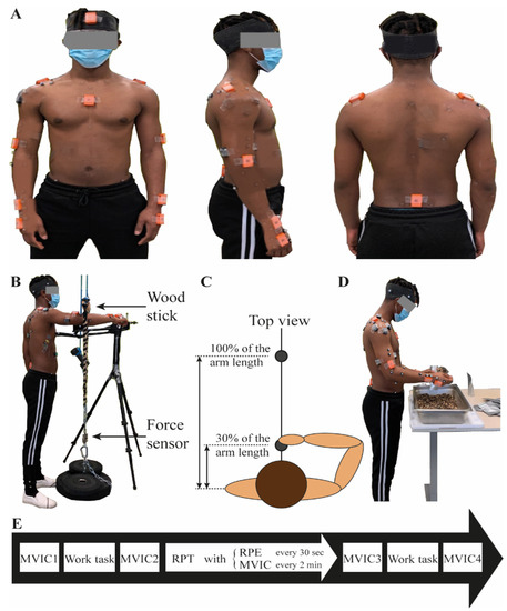 (A) Participant equipped with IMUs. (B) Picture of the MVIC setup. (C) Schematic top view of the RPT. (D) Work task. (E) Timeline of the experiment.