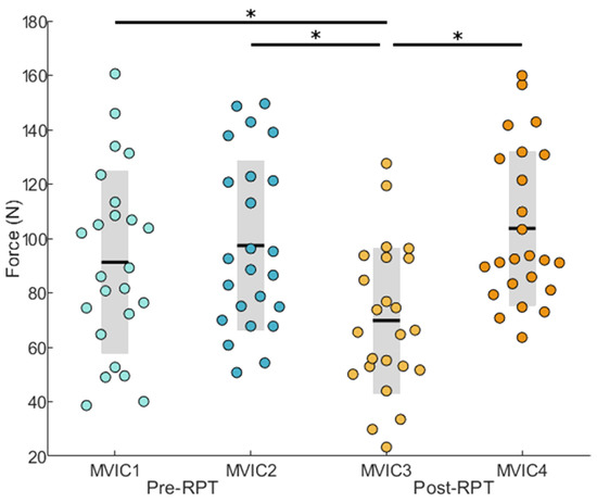 Maximum voluntary isometric contraction. A one-way ANOVA with repeated measures on Time (MVIC1, MVIC2, MVIC3, MVIC4) was performed on maximum voluntary isometric force, followed by a Tukey post hoc analysis.