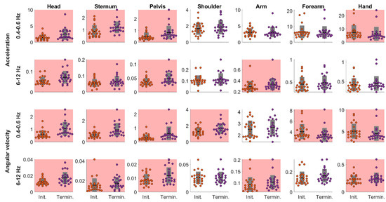 RPT Initiation versus Termination power spectrum for the acceleration and angular velocity in the 0.4–0.6 Hz and 6–12 Hz frequency bands for the head, sternum, pelvis, shoulder, arm, forearm, and hand. Dots represent each participants’ data. Black horizontal lines represent the participants means; grey bars represent standard deviations. Pink backgrounds indicate significant differences between task Initiation and Termination.