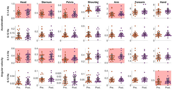 Pre- versus post-RPT work tasks power spectrum for the acceleration and angular velocity in the 0.1–4 Hz and 6–12 Hz frequency bands for the head, sternum, pelvis, shoulder, arm, forearm, and hand. Dots represent each participants’ data. Black horizontal lines represent the participants means; grey bars represent standard deviations. Pink backgrounds indicate significant differences between Pre- and post-RPT work tasks.