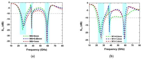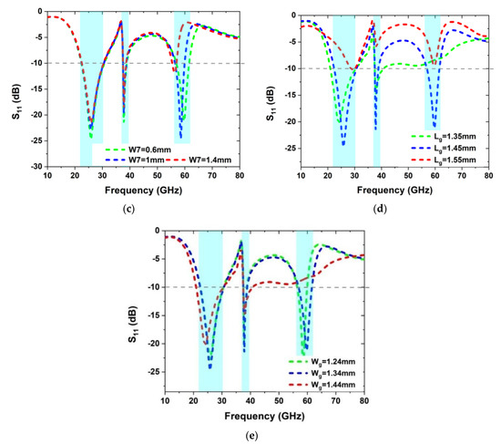 A parametric analysis of the important parameters is carried out to get the optimum results with a broad bandwidth and to enhance impedance matching. Tri-band operation may be achieved at the ideal height of H = 0.25 mm, with 28 GHz, 38 GHz, and 60 GHz all supported. It is critical to consider the slot’s length and width while designing an antenna that will provide the desired resonance frequencies, broad impedance, and high impedance matching. For the truncated edges of the slot’s width (W6), parametric analysis is shown in Figure 2. Impedance mismatches are seen in the 28 GHz range when W6 is raised to 0.68 mm; the other two bands remain the same. The bandwidth and impedance mismatch are both reduced when W6 is set to 0 mm, however. Because of this, it is proposed that the best value for W6 in terms of bandwidth and triband functioning at mm-wave frequencies is 0.68 mm. The parametric analysis of the upper C-shaped slot is varied from 0.8 mm to 1.2, as shown in Figure 2b. It can be seen that by varying the values of the C-shaped slot, the lowest band (28 GHz) and the upper band (60 GHz) remained unchanged, while the middle band (38 GHz) changed. Similarly, the V-band frequency ranges from 56 to 61 GHz when the U-shaped slot’s width is adjusted to 1 mm. As indicated in Figure 2c, the other two bands show signs of mismatching and shifting to undesirable frequencies. Decreased impedance matching at resonance bands and a wider V-band are both found when W7 is reduced to 1.4 mm. This has a substantial impact on antenna performance. Again, impedance mismatching, and band narrowing occur when W7 is further lowered to 1 mm. In other words, the optimal U-slot width displays the optimum performance in terms of bandwidth and reflection coefficient when it is 1 mm long. The parametric study for the length and width of the ground planes ‘Lg’ and the ‘wg’ is shown in Figure 2d,e. With the help of parametric analysis, it is analyzed that each slot in the radiator is independent to the other, which means that by varying the length and width of one slot, we can easily shift one frequency by setting the rest of the frequencies.