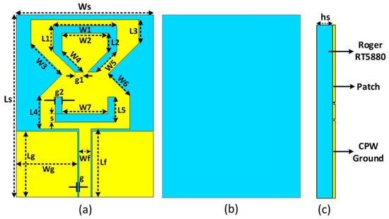 The proposed antenna’s top, back, and side views are shown in Figure 3a–c. The antenna design is modelled using Rogers R/Duroid5880 with a relative permittivity of 2.2, and loss tangent of 0.12. The thickness of Rogers material is 0.25 mm. This material has a low dielectric constant and low dielectric loss, which makes it suitable for high frequency/broadband applications. This material is isotropic and absorbs low moisture. The overall size of the proposed antenna is Ls × Ws × Hs. Copper is used on the top side of the substrate and has an effective length of . A mm-wave tri band antenna is proposed which resonates at 28 GHz, 38 GHz, and 60 GHz operating frequencies. The U-shaped and C-shaped slots are inserted in the radiator, and the center side of the rectangular monopole antenna is truncated. The truncated side, top invert C-shaped slot, and bottom U-shaped slots are used to resonate at 28 GHz, 38 GHz, and 60 GHz, respectively. A Computer Simulation Technology (CST) Studio suite is used to model the antenna design. Several antenna parameters are optimized during the design process to provide the best possible radiation characteristics. Table 1 indicates the proposed dimension parameters of the optimized antenna.