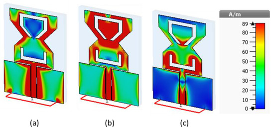 Figure 4 shows surface current distribution of the proposed antenna at various operating frequencies. Resonance frequencies (28 GHz and 38 GHz) are produced at the bottom side of the proposed antenna because of its longer effective electrical length, as shown in Figure 4a,b, respectively. As illustrated in Figure 4, the truncated side of the radiator has a major contribution in producing the 28 GHz frequency band. As shown in Figure 4b, the upper C-shaped slot helps to generate the 38 GHz frequency band, and the bottom U-shaped slot helps to operate at the 60 GHz frequency band.