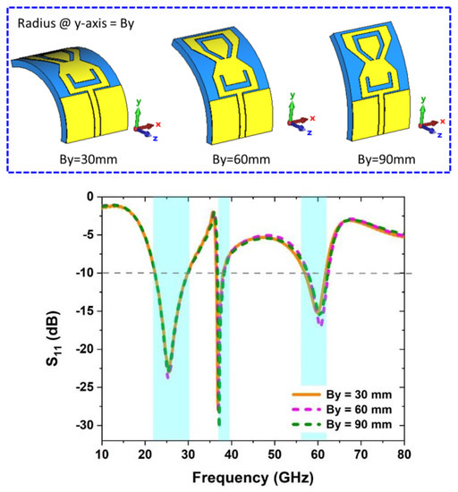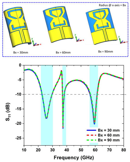 When it comes to studying S11 behavior when the antenna is in bent condition, the antenna’s bending radius along the x-axis (Bx = 30 mm to 90 mm) is chosen. As shown in Figure 5, when the antenna is bent along the x-axis, the simulated S11 results are compared over different radii. It is realized that the antenna has stable S11, even if it bent at the radius of 30 mm, 60 mm, and 90 mm.