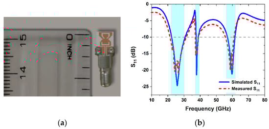 The measured and simulated results are presented in this section to validate the performance of the proposed antenna design. The antenna prototype is fabricated on ROGERS 5880 substrate, as shown in Figure 7a. A 50 ohm-thin block end launch connector (withwave®) is used to measure the return loss and radiation pattern. The maximum working frequency of this connector is 67.5 GHz [25]. The comparison between the simulated and measured return loss in shown in Figure 7b. As shown in the Figure 7b, the proposed antenna resonates at three operating modes, with operating frequencies of 28, 38, and 60 GHz, respectively. The impedance bandwidth for 28, 38, and 60 GHz are 21 GHz to 31 GHz, 37 to 39 GHz, and 56 to 61.5 GHz, respectively. There is a decent agreement between simulation and measurement results, however, the little variance is due to inaccuracies in the manufacturing and measurement equipment.