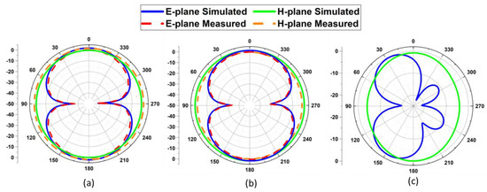 Figure 8a–c illustrates the radiation pattern of the proposed antenna at various resonance frequencies. The omnidirectional pattern in the H-plane and the elliptical pattern in the E-plane can be seen in both the 28 GHz and 38 GHz radiation patterns. For frequencies between 28 GHz and 38 GHz, a high correlation is observed between simulated and measured results. An omnidirectional pattern along the H-plane and a broadsided pattern along the E-plane is observed for the 60 GHz frequency because of the 40 GHz measurement constraint.