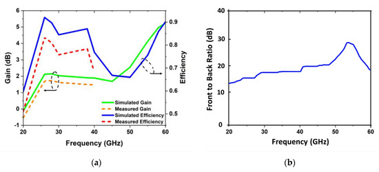 The simulated and measurement results show that the antenna’s efficiency across all frequency bands is lower than 90%, as shown in Figure 9a. Figure 9b indicates the front-to-back ratio (FBR) of the proposed antenna in free space. The value of the FBR is found to be more than 15 dB at 28 GHz and 38 GHz, while more than 28 dB for 60 GHz.