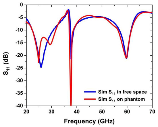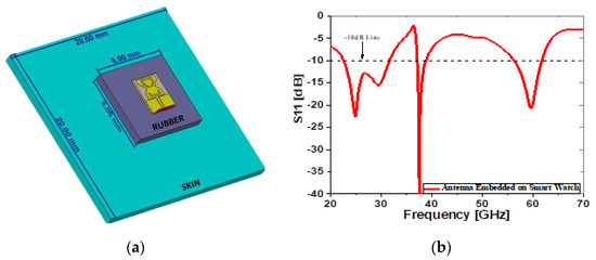 The proposed antenna is tested on a watch strap made of a rubber material and on human tissue, such as skin, to see human closeness effects. The small size antenna is maintained near the skin (ɛr = 41.4 and σ = 0.88 s/m) [20]. The size of the phantom box is equal to 20 × 20 mm2. Figure 10a shows the proposed structure when the antenna is in proximity to the human tissue, and the simulated return loss is shown in Figure 10b.