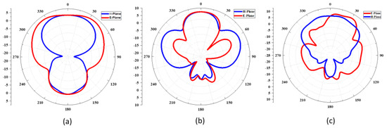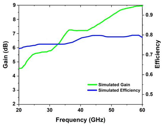 Figure 11a–c describes the radiation pattern of the proposed tri-band millimeter-wave antenna at 28 GHz, 38 GHz, and 60 GHz frequency bands. The elliptical radiation pattern in the E and H-plane is observed at 28 GHz, as shown in Figure 11a, while the broadsided directional pattern can be seen along the E and H-plane at 38 GHz. The proposed antenna shows the directional radiation pattern at 60 GHz, as shown in Figure 11c. Figure 12 illustrates the simulated gain and efficiency of the proposed antenna operating at a variety of frequency bands, including 28 GHz, 38 GHz, and 60 GHz. The simulated gain is 5.3 dB, 7.5 dB, and 9 dB at 28 GHz, 38 GHz, and at 60 GHz frequency bands, respectively. The antenna’s efficiency across all frequency bands is lower than 80%.