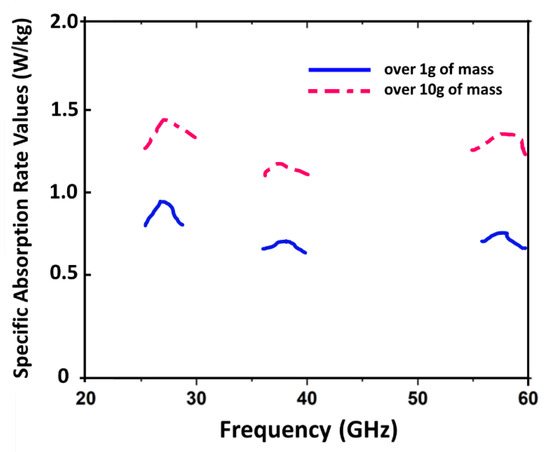 It is possible to conduct SAR simulations if the antenna is retained over the phantom. An average of 0.5 W of power is used to determine a device’s SAR based on the IEEE/IEC 6270-1 standard. Figure 13 shows the SAR values of 0.9 W/kg at 28 GHz, 0.62 W/kg at 38 GHz, and 0.74 W/kg at 60 GHz over 1 g of mass tissue. While over 10 g of mass tissue, SAR values are 1.49 W/kg, 1.17 W/kg, and 1.47 W/kg at 28 GHz, 38 GHz, and 60 GHz, respectively.
