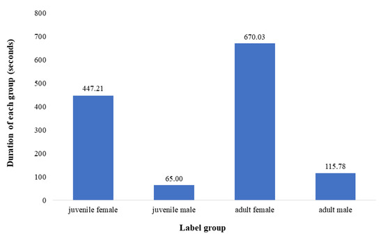 The total duration of call recordings from each grouping of pandas in this study: juvenile female, juvenile male, adult female, and adult male.
