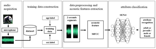 We divided the vocalization data by individual to ensure that the vocalizations in the training dataset and test dataset come from different individuals. This approach reflected real-world considerations; we usually only get the vocalization data of certain individuals for training, but we hoped that the trained model was also effective for other individuals. The size of the dataset in this paper is small and very imbalanced, due to many more vocalizations being available from certain individuals or age and sexes. We attempted to mitigate this issue through several steps. After considering several approaches for dealing with small and imbalanced datasets, we opted to use data augmentation and focal loss to attempt to improve our experimental results (Figure 2). After we processed the vocalization data from the pandas, we began to train the neural net. In this process, we only utilized one neural network, named SENet [28], to recognize different attributes of the pandas. In previous work, we used two different types of networks with one focused on local features and the other on contextual [21]. We found that SENet, a network that pays more attention to local features, was more suitable for our task. We labeled training data with two tags, one for each attribute, yielding four groups (i.e., sub-adult female, sub-adult male, adult female, and adult male). After labeling the call data, we input the MFCC in SENet to get recognition results.