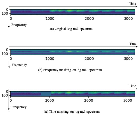 An example of frequency masking and time masking with SpecAugment. (a) is an original log-mel spectrum. (b) shows frequency masking on a log-mel spectrum, where two masks of different widths are applied on the frequency axis of the log-mel spectrum. (c) shows time masking on log-mel spectrum, where a mask is applied around the time coordinate of 1000 on the time axis of the log-mel spectrum.