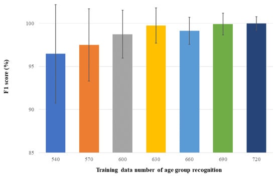 Average and standard deviation of F1 scores of the proposed method for age group recognition under different numbers of training data.