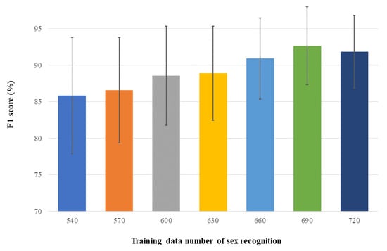 For the sex recognition, we controlled for individual mutual exclusion in the training and test data in the same way. In this task, we simply wanted to know whether the panda is female or male by vocalization. The organization of the experiments was exactly the same as above for age group recognition. Experiment 1 had an average F1 score of 94.44% (±1.56%). For Experiments 2A and 2B, the F1 scores were 80.42% (±15.64%) and 81.77% (±10.96%), respectively, again depending on whether data augmentation and cross extropy loss were utilized. The F1 score of Experiment 2C was 85.85% (±7.99%), showing an increase in F1 score when focal loss replaced cross entropy loss. Table 5 shows the exact value.