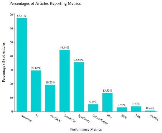 Percentages of performance metrics reported in studies reviewed.