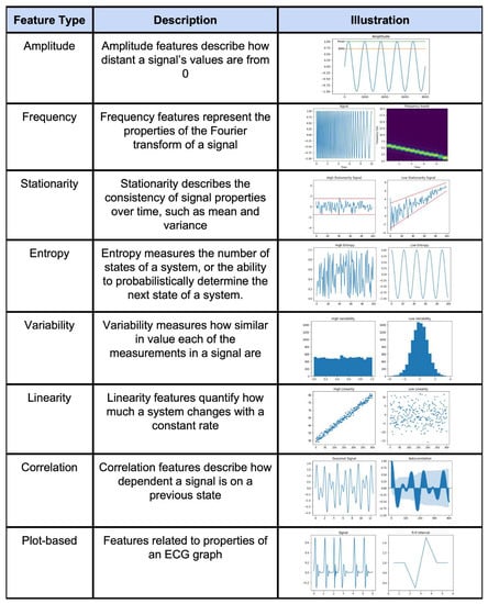 An example feature engineering technique for a time series is shown in Figure 4. Summary tables of the extracted features for general time series data as well as specific signals (HRV, EEG, etc.) and feature selection methods are presented in Supplementary Table S4a,b. Supplementary Table S5 also presents a summary table for all of the found feature selection methods. In short, feature engineering is used for all signal types across many different applications.