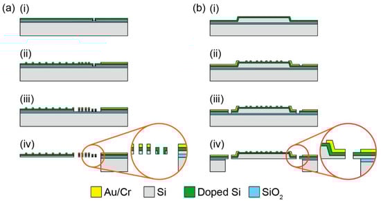 Fabrication process of (a) the biaxial MEMS force plate array for an ant [25] and (b) uniaxial MEMS force plate for a fruit fly [26]. (a-i) Doping holes are etched on the device Si layer by DRIE. A piezoresistor layer is formed on both sidewall of the etched holes and device Si surface with rapid thermal diffusion. (a-ii) Cr/Au layers are patterned on the doped Si layer. (a-iii) The device Si layer is etched by DRIE. (a-iv) The handle Si layer is etched by DRIE from the backside. The plate is released by etching the SiO2 layer with HF vapor. (b-i) Mesa structure is formed by wet etching using tetra-methylammonium hydroxide (TMAH) solution. A piezoresistor layer is formed on the device Si surface by rapid thermal diffusion. (b-ii) Cr/Au layers are deposited and patterned on the doped Si layer. (b-iii) The device Si layer is etched by DRIE. (b-iv) The handle Si and SiO2 layers are etched by DRIE and HF vapor, respectively.