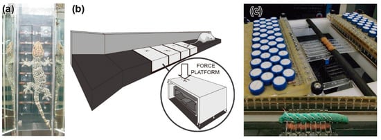 Photographs and schematic image of force plate arrays for a small animal. (a) Climbing gecko on a force plate array. Reprinted/adapted with permission from [79]. 2022, Company of Biologists Ltd. (b) Force plate array for a running mouse. Reprinted/adapted with permission from [81]. 2022, Elsevier. (c) Cantilever-type force plate array for a caterpillar. Reprinted/adapted with permission from [86]. 2022, Elsevier.