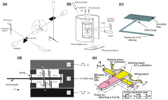 Schematic images of micro-force probes for flies. (a) Biaxial force probe using lasers and photodiodes. Reprinted/adapted with permission from [109]. 2022, Company of Biologists Ltd. (b) Single force probe using a laser and a photodiode. Reprinted/adapted with permission from [111]. 2022, Company of Biologists Ltd. (c) Biaxial MEMS piezoresistive force probe. Reprinted/adapted with permission from [30]. 2022, IEEE. (d) Single-axis MEMS capacitive force probe. Reprinted/adapted with permission from [31]. 2022, IEEE. (e) Triaxial MEMS piezoresistive force probe. Reprinted/adapted with permission from [37]. 2022, IEEE.