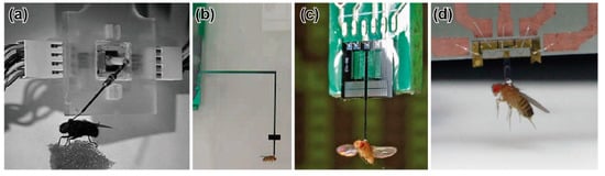 Alternatively, measurement science and technology, utilizing, for example, microelectromechanical systems (MEMS), has been developed, and we can easily obtain a tool to measure tiny forces [21,22,23]. Accordingly, using MEMS-based force sensors, recent studies have reported direct methods for measuring the force exerted by small animals, such as insects, which was difficult in previous studies [24,25,26,27,28,29,30,31,32,33,34,35,36,37]. In these studies, the force sensor itself has been specially developed for the target insect, including the sensor size and structure, force range and resolution, time resolution, resonant frequency, and so on.