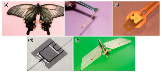 - Hagiwara, T.; Takahashi, H.; Takahata, T.; Shimoyama, I. Ground effect measurement of butterfly take-off. In Proceedings of the 2018 IEEE Micro Electro Mechanical Systems (MEMS 2018), Belfast, UK, 21–25 January 2018; pp. 832–835. [Google Scholar]