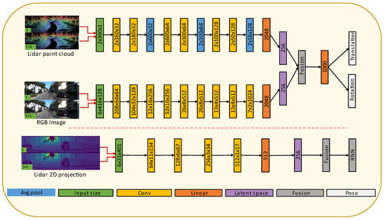 Once each image and LiDAR data are encoded as described, each sequential LiDAR and camera data scan is concatenated. The images are concatenated channel-wise to give a sequence of 6 × 128 × 416. The LiDAR data become 2 × 3601 size after concatenation of two consecutive scans. The concatenated LiDAR shape enables the network to pass a convolutional layer for feature extraction.