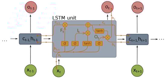 Although the classic RNN can learn temporal information, it suffers from a vanishing gradient when the gradient passes over a long timestep. Long-short-term memory (LSTM) has been introduced to overcome this problem [42]. There are three gate systems in LSTM: an input gate, an output gate and a forget gate, represented as sigmoids (σ) or hyperbolic tangents (tanh) functions in Figure 7. These gates are used to decide which past information to be maintained and discarded when updating the current state. In the proposed method, we use a bi-directional LSTM, a construct of two LSTM. There are 1000 hidden states for each LSTM layer.