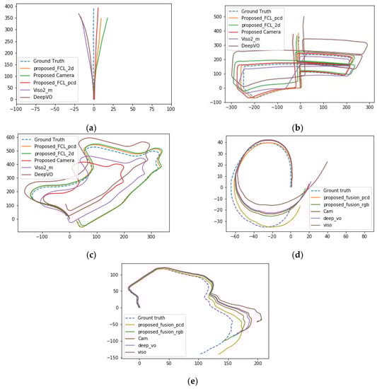 Results of the proposed algorithm’s trajectory (measured in meters) on the testing sequence. (a–c) Results with KITTI dataset sequence 04, 05 and 09, respectively; (d,e) results with sequence 01 and 02 of LboroAV2 dataset.