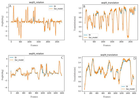 Results of our proposed method’s estimated translation and rotation plotted against the ground truth (results from KITTI 05 (A,B) and 09 (C,D) used as a sample).