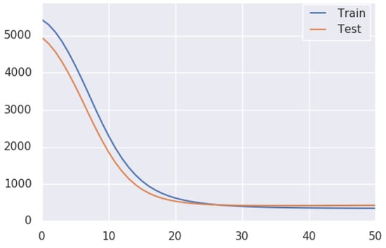 It is also evident in Figure 9 that estimated trajectory errors are not evenly distributed throughout each sequence. The result shows that most translation and rotation occurred around turns. When the car approaches turns, it reduces speed or comes to a stop. The amount of training data on KITTI while the car is driving lower than 20 km/h and greater than 50 km/h is minimal; errors are observed higher in this region. A major part of the translation error originates when the car is driven at a speed of more than 50 km/h or when the translation between two consultive frames is more than 1 m, as shown in Figure 9B,D. The proposed method loss function curve is presented in Figure 10.
