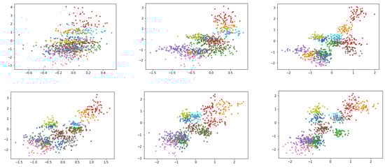 Visualisation of the compressed representation through the training cycle. Each colour represents elements in the compressed dimension. This result was obtained by training the model with a 16-dimensional compressed representation to make the visualisation more expressive.
