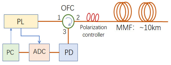 The experimental set-up is shown in Figure 1. The pulse laser (PL) generates probe pulse light, and it is launched into the first port of the optical fiber circulator (OFC), and then it is output from the second port of OFC and its polarization state is adjusted by the polarization controller. Then, the probe light pulse comes into the multi-mode fiber (OM1 62.5/125) with a length of about 10 km. The laser linewidth of PL is about 6 MHz. The pulse width is 10 ns and the pulse peak power is about 33 dBm. The backscattered Rayleigh light of the propagating light pulse in the MMF passes through the second and the third ports of OFC and at last it is converted into the voltage signal by the photodetector (PD). The voltage signal output from PD is sampled by the data acquisition card (DAQ) with a sampling rate of 100 Msps. The PL, OFC, polarization controller, and PD are with SMF, so the connection between the polarization controller and MMF may cause light power loss. The loss from the polarization controller to MMF can be omitted, and the measured loss from MMF to the polarization controller is 7.2 dB. DAQ collects the voltage signals and sends the corresponding data to a personal computer (PC), where the data are processed and analyzed and the vibration information along the fiber under test (FUT) is presented. PC also controls PL and sets the parameters of the probe pulse such as the pulse width and peak pulse power.