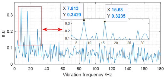 Once the vibration event is located, the next task is to extract the vibration spectrum. The FFT method is commonly used in DVS for multiple point vibration detection [22]. When the FFT algorithm is adopted to compute the data at the vibration position, we find that the vibration spectrum cannot be effectively extracted. So, we consider the averaging of the data of a certain position range to improve SNR of the vibration signal. Then, the data at the vibration position and positions within 20, 50, 100, 1000, and 5000 m and all the positions behind the vibration position are averaged, respectively. Finally, by FFT, the obtained spectrum is consistent with that shown in Figure 5. The measured vibration frequency is 7.8 Hz, which agrees with the event loaded on MMF well. In addition, there is a frequency doubling component in Figure 5, and it is inferred that this is caused by the fiber vibration interaction from different positions with the optical polarization state propagating in FUT.