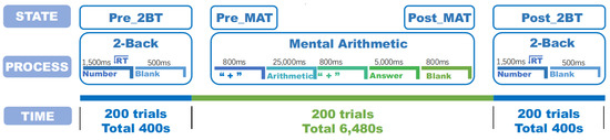 The whole experimental task that each participant needed to perform was composed of three mental tasks. 2-BT was completed first, then MAT, and finally 2-BT. The 2-BT was performed before and after the MAT, respectively (denoted as Pre_2BT, Post_2BT hereafter). There was no time interval between task switching in this experiment. The experimental process is shown in Figure 1.
