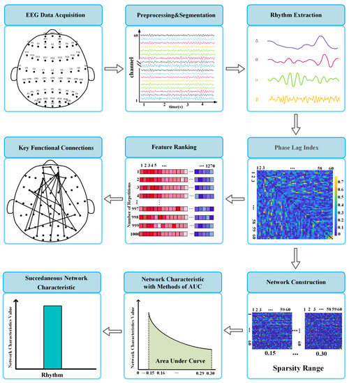 In this study, for the ranking of functional connections, the weights of the features were calculated by the sorting criteria of the SVM-RFE internal classification model. The feature with the lowest weight would be removed. The same steps were executed for the rest features to remove the feature that had the lowest impact on the classification until all features were removed. To improve the robustness of ranking, we performed 1000 times of feature sorting with 90% samples used every time, resulting in 1000 × n ranked feature set (n is number of the statistically significant features in each rhythm). The final ranked feature set is obtained through counting (that is, the most common feature in the first column is the first significant feature; the most common feature in the first and second column is the second significant feature, and so on). All the above algorithms were implemented using MATLAB 2019b (Mathworks Inc., Natick, MA, USA). The schematic flow chart of the data analysis approach is shown in Figure 2.