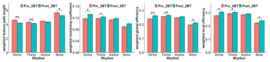 Network topology characteristics of four different rhythms during Pre_2BT and Post_2BT tasks, error bars are the standard deviation divided by the root number 20. * Indicates p < 0.05, ** indicates p < 0.01.